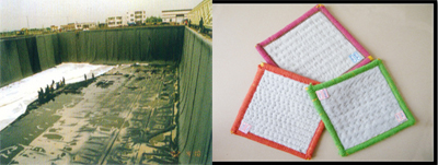 該材料安裝于地下防水(防滲)工程中,具有長效、自行封閉、施工簡便、環保、性價比高的特點。膨潤土粒子吸水膨脹在添加劑作用下,形成均勻的膠體系統,其滲透系數為10-9cm/s,并充滿整個空間,在人為外力限制作用下,使防水毯的膨脹從無序到有序,持續的吸水膨脹結果,使防水毯自身達到密實,從而具有防水作用。一些膨潤土顆粒在一定的大壓力作用下可直接進入周圍土體的細小裂隙及混凝土結構的細下裂隙中遇水膨脹,進一步保證了地下工程防水抗滲性能。